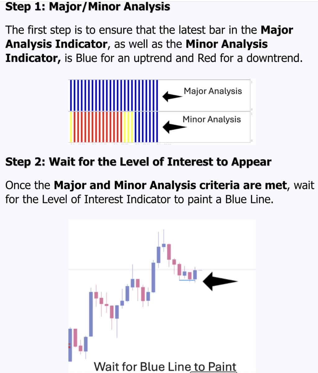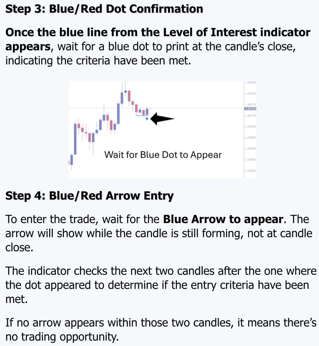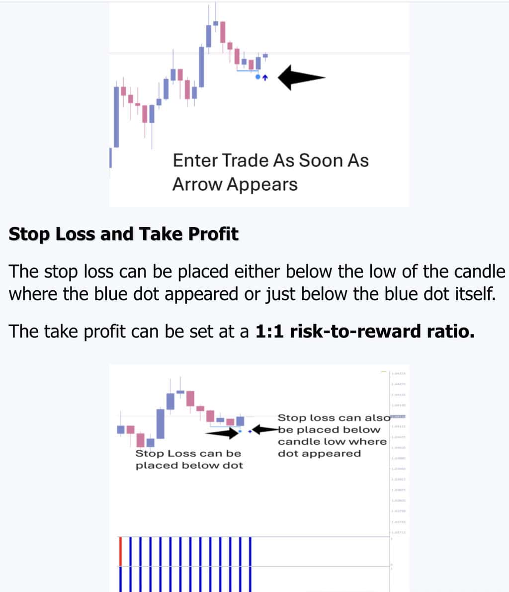 - Built for Simplicity: Just a 4-step method using color coded indicators. No guesswork. It analyzes trend direction, shows clear entries with dots and arrows, and even suggests risk/reward and stop levels built in.