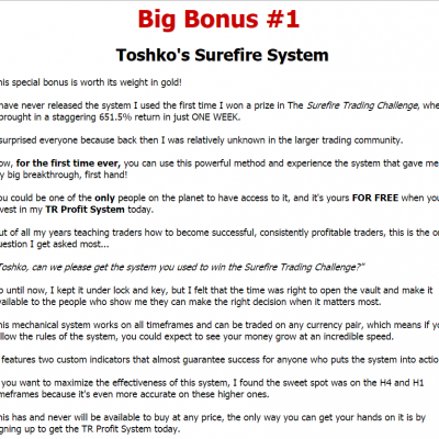 Toshko’s Surefire System is a system Toshko used to win the Sure-fire Trading Challenge. Toshko has released this system as a bonus for buyers of his TR Profit System. You can purchase it separately for $29, by why not get it for FREE with what’s been called “one of the best systems out there”: Toshko’s TR Profit system.